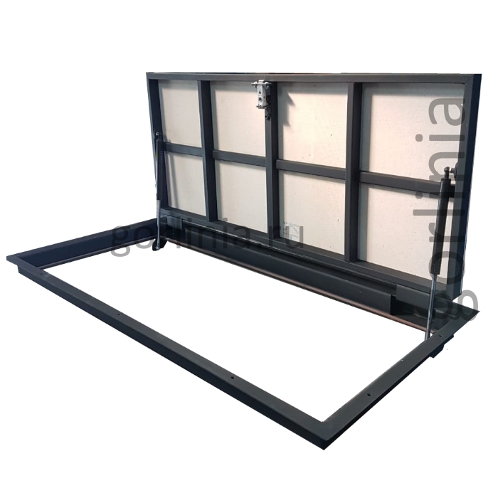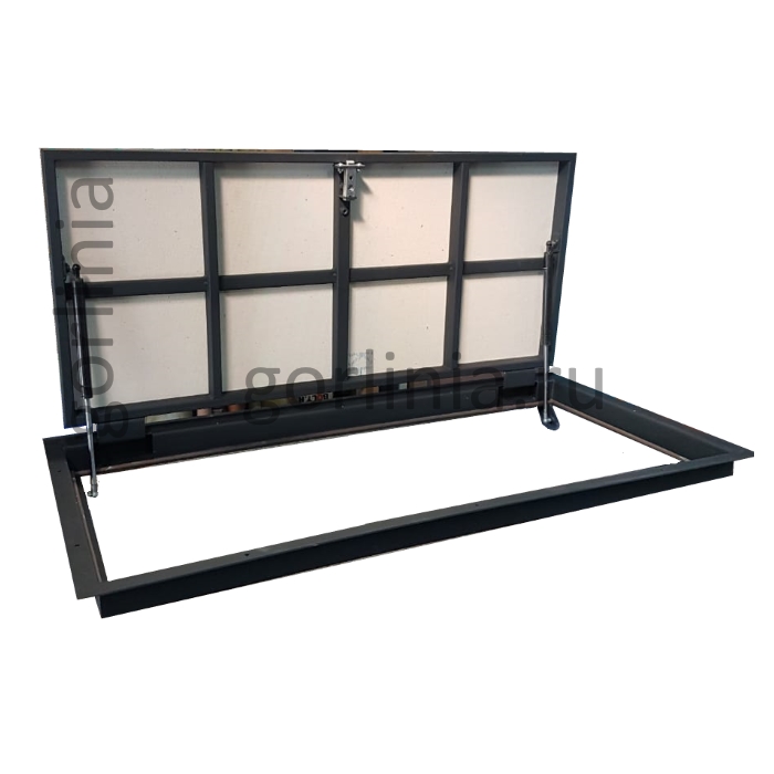 Облегченная модель в угол комнаты или под лестницу без щелей в полу со смещенными за ось открывания петлями через вырезанные в раме ниши. Легкая ходовая часть на амортизаторах и удобный монтаж с облицовкой крышки керамическим или ламинированным покрытием.