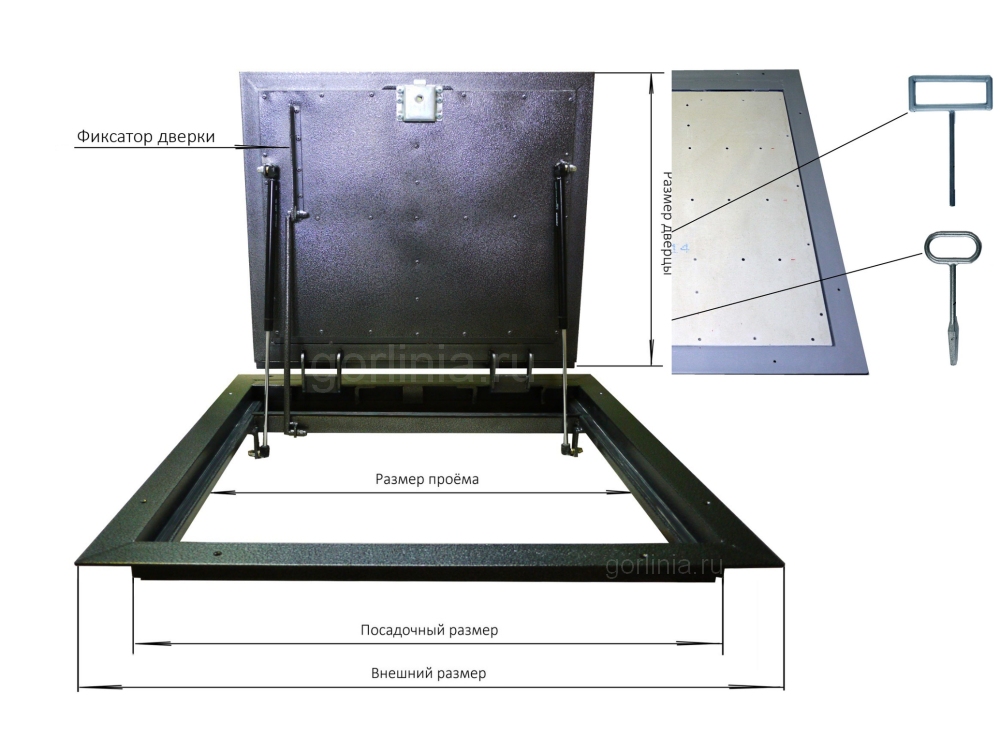 Створка в сэндвиче из листовой стали обшита плитой ГВЛВ в уровень с полкой наличника рамы, все элементы фурнитуры (замок, газлифты, шарниры) скрыты внутри: верхняя лицевая часть подготовлена под финишной отделку плиткой/ламинатом с отступами и зазорами по схеме завода-изготовителя.